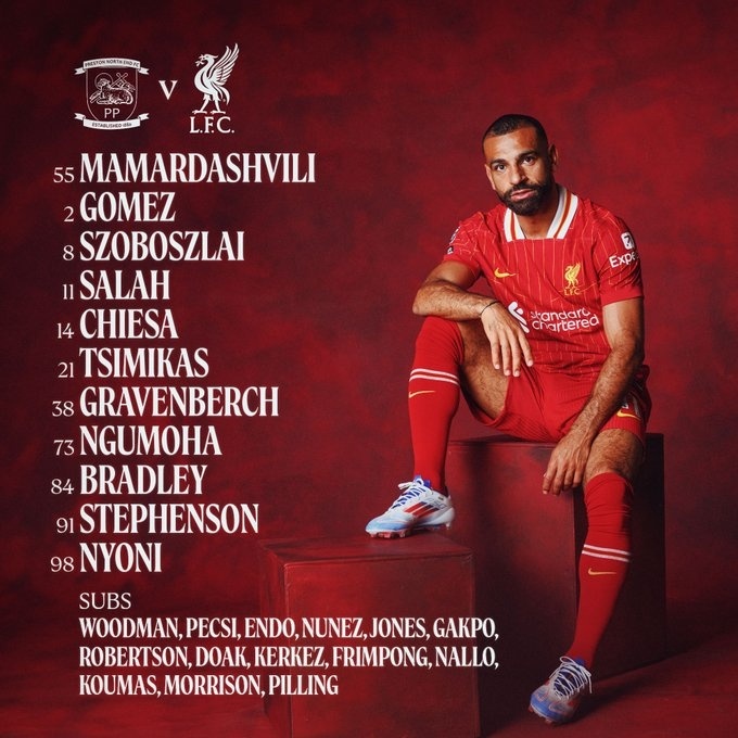 利物浦vs普雷斯顿首发:玛玛达什维利首秀!萨拉赫先发维尔茨缺阵