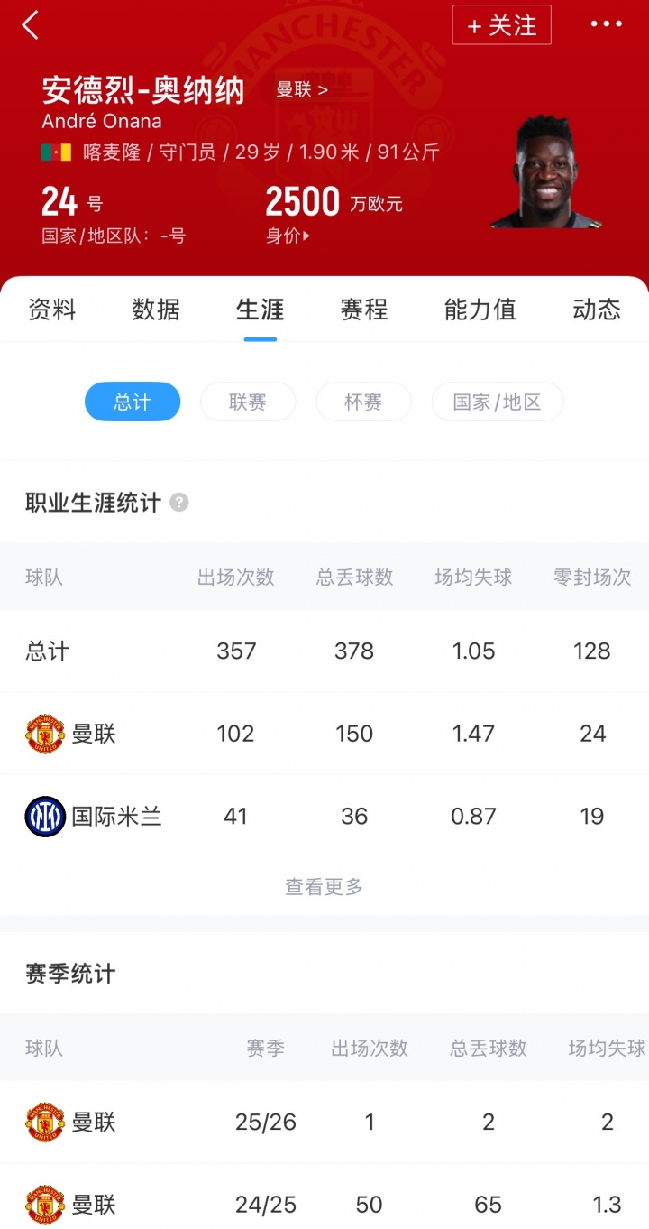 奥纳纳现年29岁,曼联在2023年花费5020万将他从国际米兰引进,目前德转身价为2500万欧元。新赛季奥纳纳仅仅在联赛杯出场一次,且点球大战不敌英乙球队格林斯比,曼联本赛季英超三场巴因德尔全部首发。