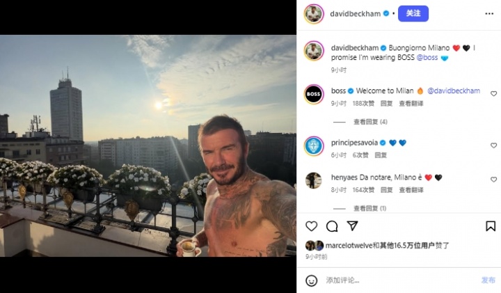 他还在社媒上发布了一张在酒店套房阳台上赤裸上身的照片。这向米兰、时装周乃至英格兰足坛都传递了一个明确的信息——贝克汉姆的影响力从未消退。
